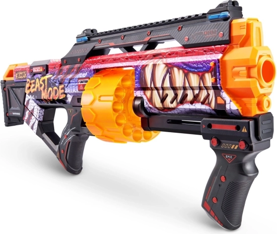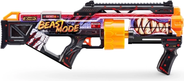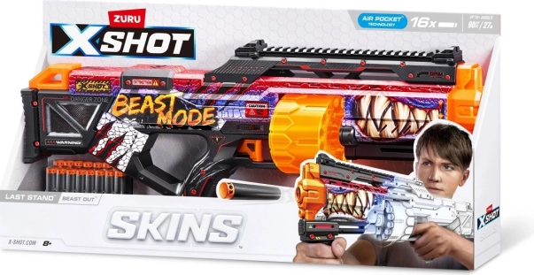 X-Shot Skins Last Stand Beast Mode este un blaster pentru copii, puternic, cu săgeți din spumă, dotat cu tambur rotativ pentru 14 săgeți, rază de acțiune de până la 27 m și un pachet de 16 săgeți cu tehnologie Air Pocket. Datorită mânerului tactic și șinei de armare, se manevrează ușor, iar designul Skins Beast Mode îți garantează stil în orice bătălie.