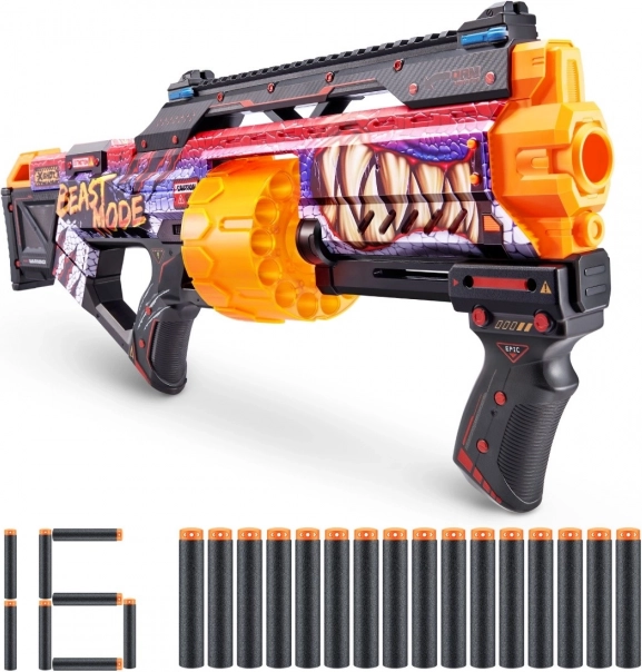 Intră în acțiune cu forță și stil: X-Shot Skins Last Stand Beast Mode combină un aspect e-sports atrăgător cu performanțe practice. Tamburul rotativ găzduiește până la 14 săgeți, astfel încât poți trage una după alta, bucurându-te în același timp de un control fluid datorită mânerului tactic și șinei de armare.