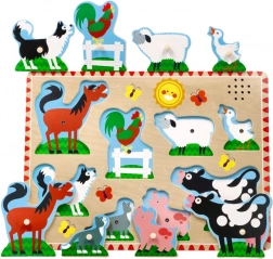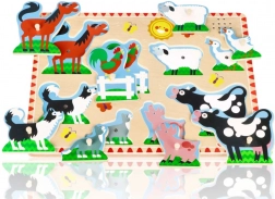Puzzle din lemn distractiv și educativ pentru copii cu tematica animalelor de la fermă. Datorită pieselor colorate și ușurinței de manipulare, copiii învață să recunoască animalele și își dezvoltă motricitatea fină.