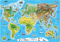Descoperă lumea din confortul casei cu puzzle-uri jucăușe pentru copii și adulți. Puzzle geografic cu harta lumii oferă o prezentare a continentelor, a monumentelor mondiale și a animalelor pe regiuni. Excelent pentru distracție și învățare, cu ilustrații realizate de un artist plastic ceh.