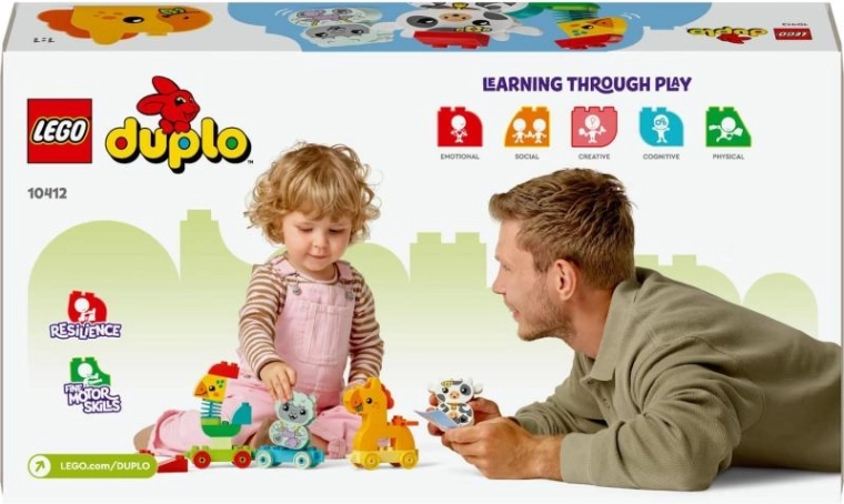 Setul conține 4 animale de construit (cocoș, cal, oaie și văcuță) și 3 vagoane robuste, ușor de conectat. Piesele mari, rotunjite DUPLO sunt sigure și ideale pentru mâini mici. Părinții se pot implica cu ușurință pentru a încuraja joaca liberă, exprimarea și descoperirea lumii.