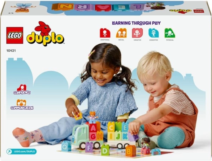 Setul LEGO DUPLO Camion cu alfabetul le oferă copiilor o modalitate distractivă de a descoperi literele. Datorită pieselor mari și ușor de manevrat, cei mici învață culorile, literele și formarea cuvintelor simple, în timp ce își exersează coordonarea mână–ochi. Camionul mobil cu remorcă detașabilă și cele două figurine invită la joacă narativă deschisă.