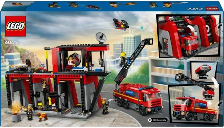 - Stație de pompieri plină de acțiune – bază modernă, platformă de aterizare, bară pentru coborâre a minifigurinelor, bucătărie și zone de relaxare.