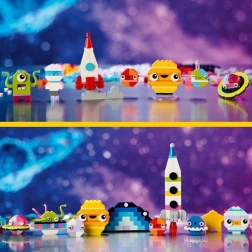Acest set creativ îi invită pe micii exploratori în lumea spațiului: construiește o rachetă, o astronaută, un extraterestru amuzant și un mini sistem solar (Marte, Pământ, Soarele și Saturn cu inele). Datorită culorilor vii, pieselor variabile și elementelor luminoase, copiii reconstruiesc cu ușurință și explorează noi combinații.