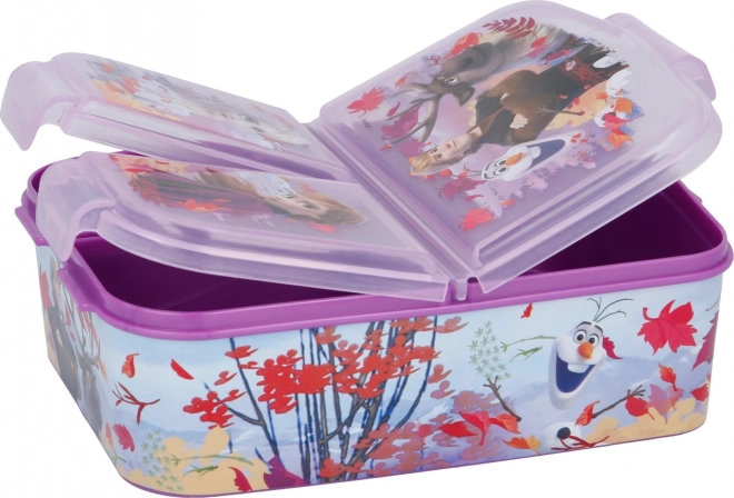 Cutia multi pentru gustări, cu licență oficială FROZEN II, încântă prin designul frumos și compartimentarea interioară bine gândită. Trei secțiuni separate permit organizarea fructelor și legumelor, a sandwichului și a micilor gustări, astfel încât gustarea rămâne proaspătă și ordonată pe tot parcursul zilei.