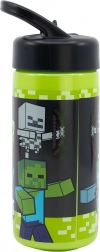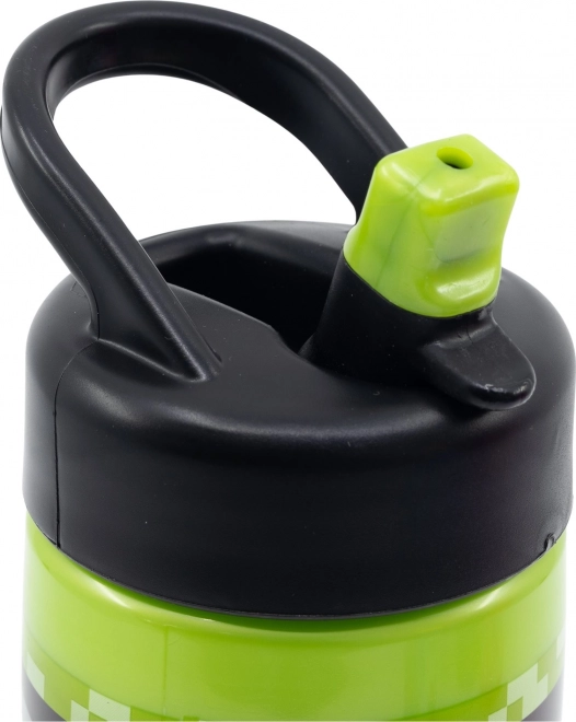Sticlă de băut stilată din plastic cu motiv MINECRAFT, cu un volum de 410 ml, ideală pentru școală, cluburi și excursii. Are capac de siguranță cu pai împotriva scurgerilor, mâner practic pentru transport ușor și este fără BPA și ftalați. Se curăță ușor și se potrivește perfect în mâna copilului.