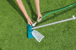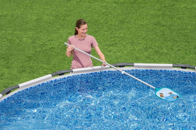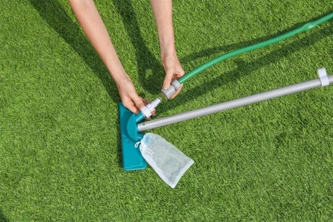 Setul conține componente precum aspirator și plasă pentru îndepărtarea eficientă a impurităților din piscină.