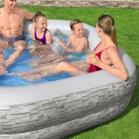 Această piscină de colț, care economisește spațiu și are model de piatră, se potrivește perfect pe terasă sau în grădină. PVC-ul durabil și pereții groși asigură o durată lungă de viață, în timp ce marginea superioară moale invită la ședere confortabilă și răcorire în zilele toride. Datorită supapei practice de golire, poți goli piscina cu ușurință după baie.