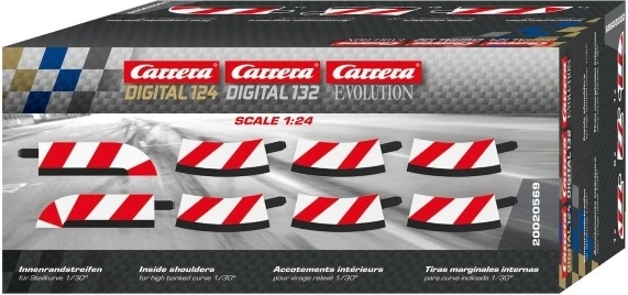 Set practic de borduri interioare pentru viraj înclinat 1/30° care lărgește pista și crește stabilitatea modelelor. Compatibil cu pistele CARRERA EVOLUTION, DIGITAL 132 și DIGITAL 124. Pachetul conține 6 bucăți cu raza R1 pentru instalare ușoară și trecere mai lină prin viraj.