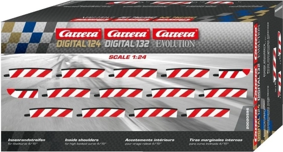 Set practic de borduri interioare pentru virajul înclinat 4/15° care îmbunătățește stabilitatea și fluența rulării pe pistele CARRERA EVOLUTION, DIGITAL 132 și DIGITAL 124. Pachetul conține 12 bucăți de borduri cu raza R4, care lărgesc banda pe partea interioară a virajului și cresc aderența și siguranța în pasajele rapide.