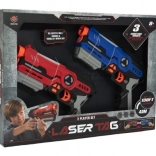 Acest set de două pistoale laser aduce un joc de acțiune grozav pentru doi jucători. Datorită detectării loviturilor până la 40 de metri, veți savura dueluri palpitante în grădină sau în living. Trei indicații luminoase pe armă arată clar viețile rămase, iar efectele luminoase și sonore oferă jocului o atmosferă și mai intensă.