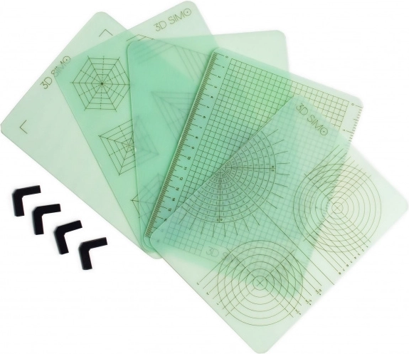 - Forme geometrice, suport pentru fixarea șablonului pe hârtie și alte ghidaje pentru desen 3D
