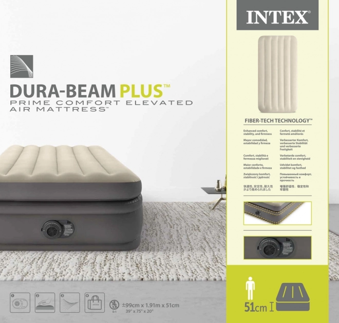 Salteaua gonflabilă cu înălțime dublă de 51 cm ușurează urcarea și coborârea și oferă senzația unui pat veritabil. Vinilul rezistent cu suprafață fină, flockată este plăcut la atingere și ușor de întreținut. Structura internă Dura‑Beam din fibre asigură suport uniform pentru corp și stabilitate pe termen lung fără balans neplăcut.
