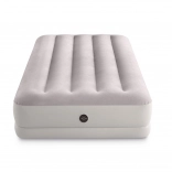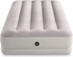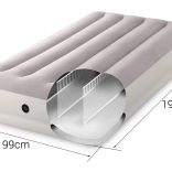 Patul gonflabil INTEX combină materialul PVC rezistent cu o suprafață flock catifelată, plăcută la atingere, care îmbunătățește confortul somnului. Construcția înălțată, cu camere longitudinale și armături interne, asigură stabilitate fără efect de balans și o susținere fiabilă a coloanei.