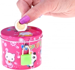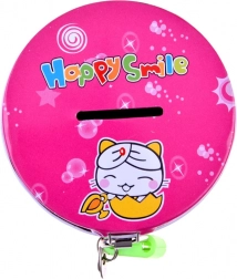 Suprafața metalică roz, cu motive vesele cu animăluțe și inscripția Happy Smile, atrage copiii și susține obiceiuri pozitive în gestionarea banilor.