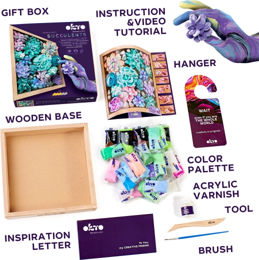 Set creativ pentru iubitorii de creație și începători. Realizați suculente realiste din pastă autoîntăritoare și expuneți-le într-o ramă elegantă din lemn 21 × 21 cm. Pachetul conține tot ce aveți nevoie – pastă, instrument de modelare, pensulă și instrucțiuni ilustrate – doar deschideți și începeți să creați.
