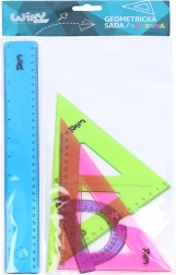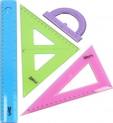 Set geometric școlar practic pentru desenare și predare zilnică. Conține riglă dreaptă de 30 cm, raportor mic și două triunghiuri într-o variantă colorată, clară, pentru orientare ușoară.