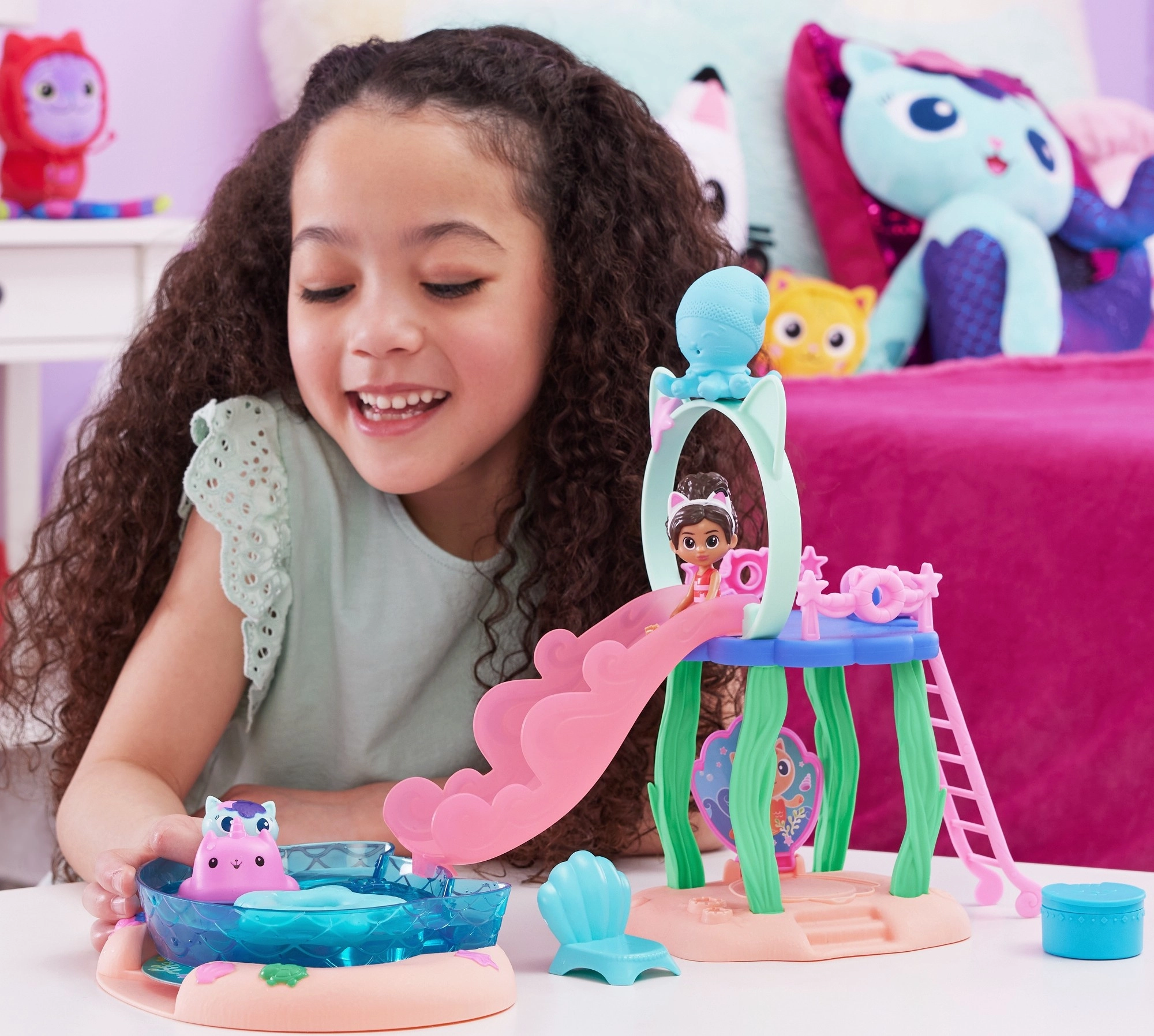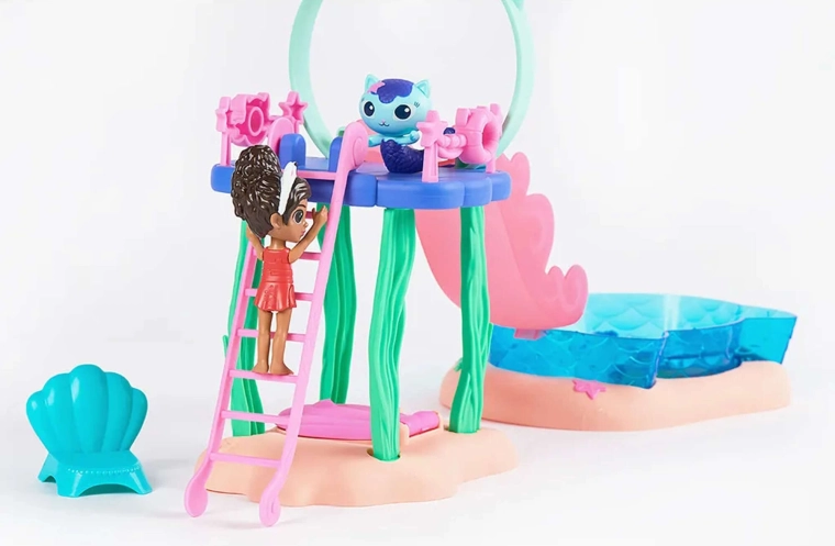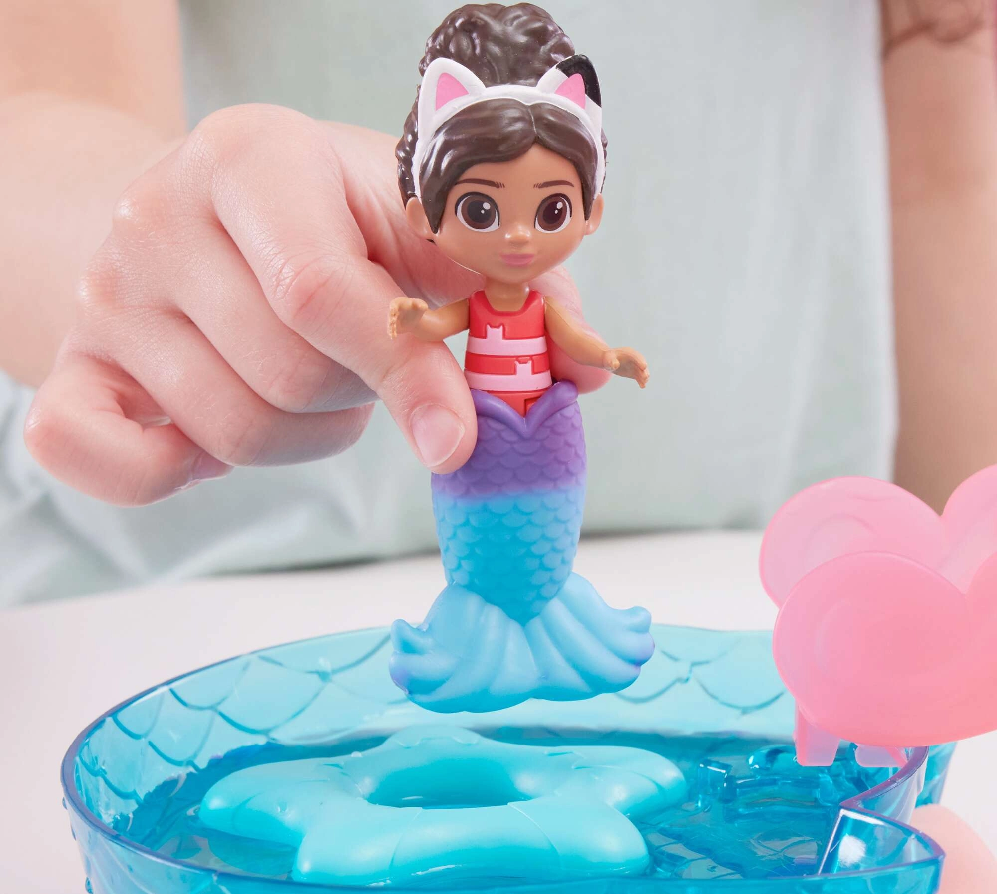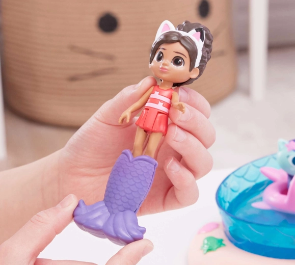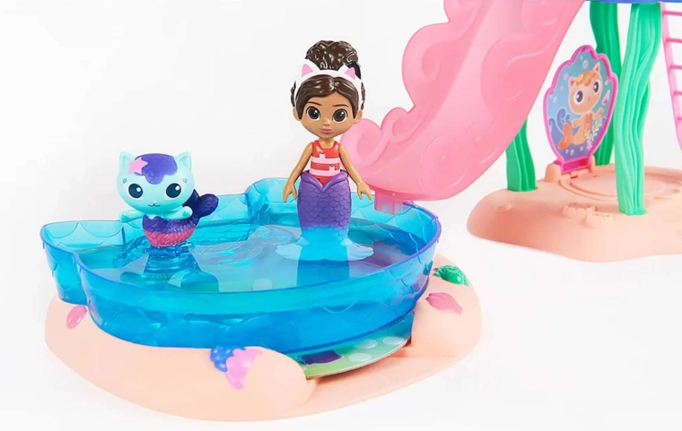 Intră în lumea Căsuței cu un set grozav cu piscină, unde Gabi și Sirena alunecă pe toboganul roz direct în piscina albastră. Folosește pulverizatorul în formă de caracatiță pentru a activa schimbarea magică de culoare pe înotătoarele cozii și descoperă surpriza ascunsă în uriașa scoică de sub tobogan.