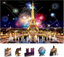 Puzzle-ul este față-verso (2‑în‑1): pe o parte asamblezi după motivul colorat al Parisului de noapte cu artificii, iar pe cealaltă după modelul repetitiv, doar după formele pieselor. Muchiile netede, fără așchii, sunt asigurate de prelucrarea laser de înaltă precizie și de placa HDF cu grosimea de 3–4 mm. În cutie găsești și o planșă separată de referință pentru o asamblare mai comodă.