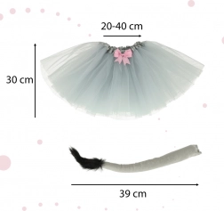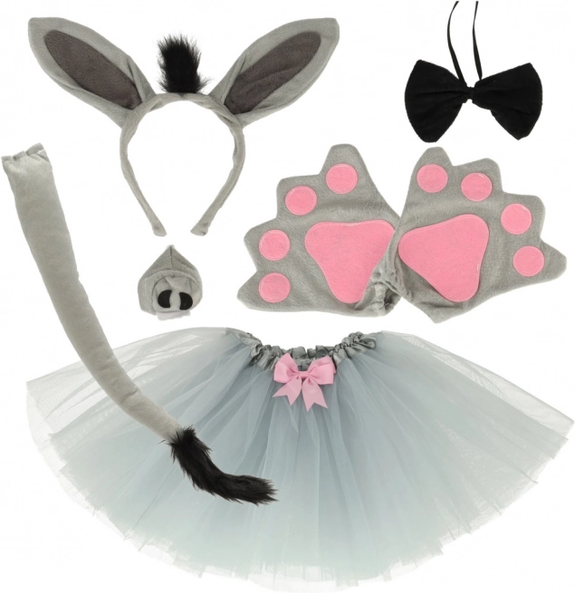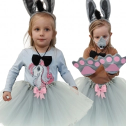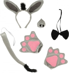 Acest costum vine cu mai multe accesorii, incluzând o bentiță cu urechi, mănuși, botic, coadă și papion.