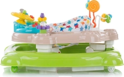 Un alt avantaj îl reprezintă cele patru roți, dintre care cele din față sunt pivotante la 360 de grade, precum și panoul colorat cu jucării și modul muzical, care stimulează creativitatea. Setul include și un mic telefon detașabil pentru și mai multă distracție. Premergătorul se pliază și se depozitează ușor, iar montajul este rapid și simplu. Panoul muzical este alimentat de două baterii AAA (nu sunt incluse).
