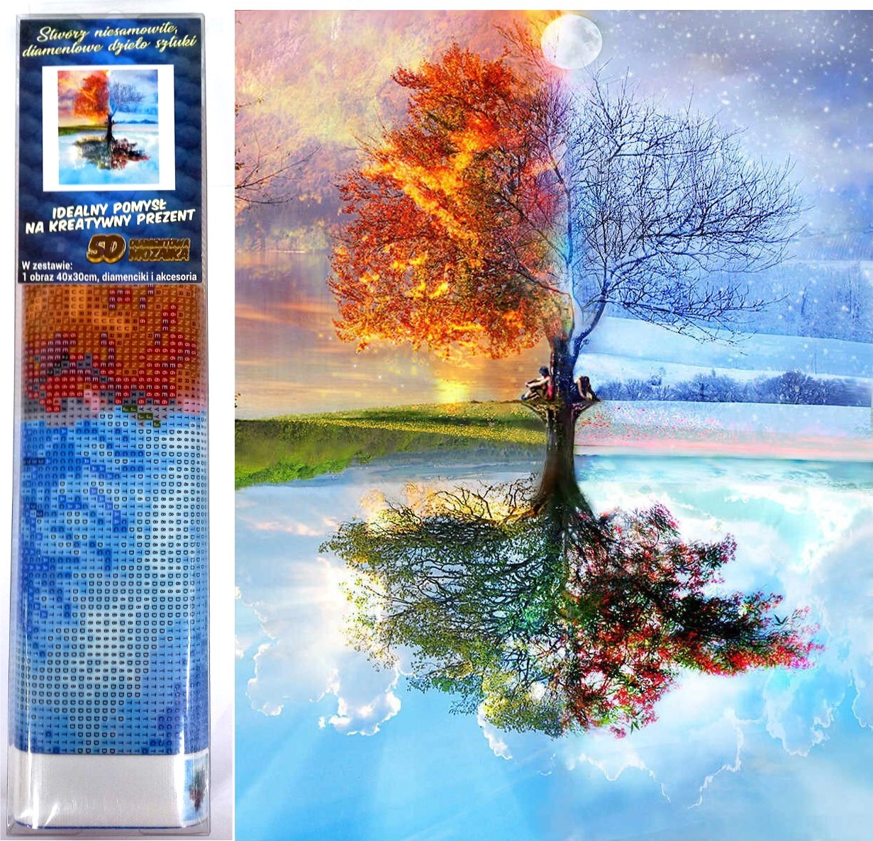 Descoperă lumea relaxantă a picturii cu diamante și creează un tablou impresionant cu motivul arborelui în cele patru anotimpuri, cu dimensiunea de 30 × 40 cm. Setul conține tot ce ai nevoie și este ideal ca distracție creativă pentru copii și adulți. Datorită aplicării simple a pietricelelor cu ajutorul stiloului, tehnica poate fi stăpânită de oricine, fără experiență anterioară. Tabloul final poate fi ușor înrămat și transformat într-un cadou original sau o decorațiune pentru casă.