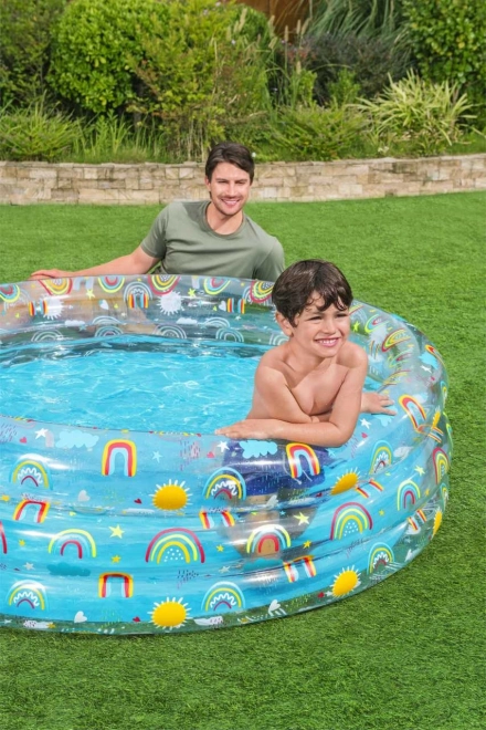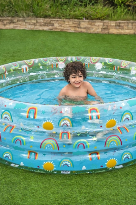 Cu motive de curcubeu și soare, această piscină nu este doar practică, dar și estetic atrăgătoare, invitând copiii la joacă.