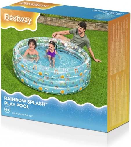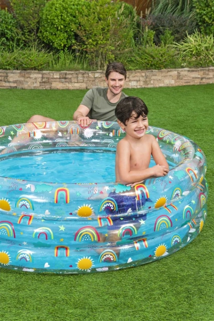 Oferiți copiilor dvs. experiența perfectă de vară cu piscina gonflabilă Tropical Bestway, care se potrivește în orice grădină. Această piscină transparentă cu motive atrăgătoare de curcubeu și soare este proiectată pentru ore întregi de distracție și răcorire în zilele fierbinți.
