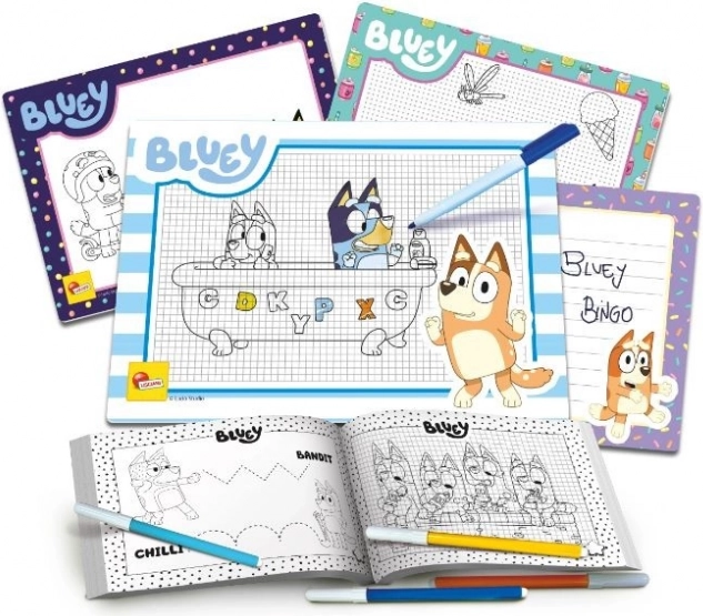 Descoperiți amuzanta Școală de desen BLUEY – un set creativ cu care copiii învață pas cu pas să deseneze îndrăgitul Bluey și alte personaje. Include un caiet de lucru cu niveluri progresive de dificultate, 4 tăblițe pentru scris și șters pentru exersare la nesfârșit și markere incluse pentru colorat.