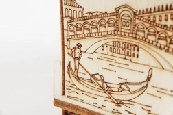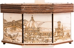 Gravurile detaliate cu scene urbane și suprafața netedă, naturală, transformă cutia într-un accesoriu stilat și o decorațiune.