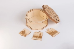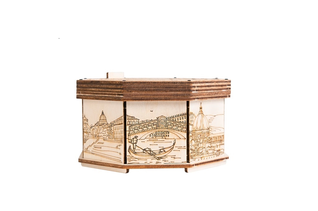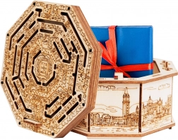 Secret Maze Box este o cutie din lemn, realizată cu precizie, cu un mecanism ingenios, care servește excelent drept ambalaj de cadou și cutie stilată pentru valori. Spațiul interior de 10 × 10 × 4,5 cm poate găzdui bancnote, un inel, bijuterii mici sau un mesaj personal. Deschiderea nu este evidentă – mai întâi trebuie rezolvate indiciile discrete și mecanismul.