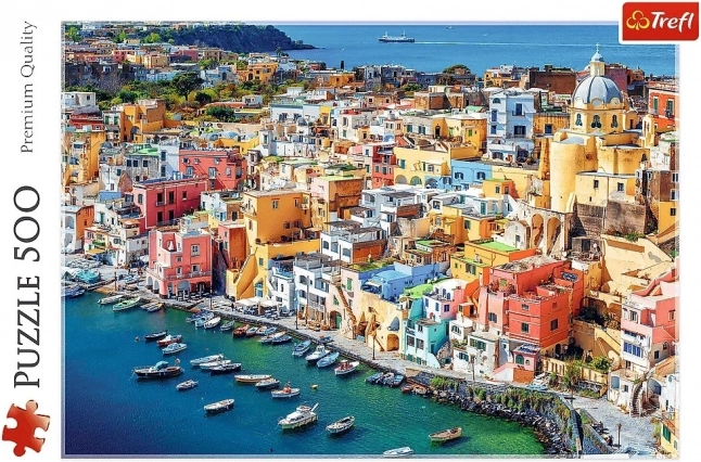 Puzzle-ul prezintă frumosul oraș de coastă Procida cu clădiri colorate și o scenă litorală minunată.