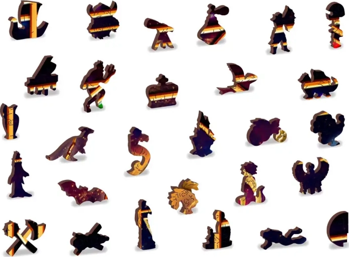 Puzzle-ul din lemn WOODEN CITY, decupat cu laser și cu piese special conturate, este incredibil de distractiv. O parte dintre piese au forme de animale, clădiri sau obiecte, ale căror detalii accentuate cu laser amplifică efectul final. Aceste piese pot sta singure ca mici figurine. Asamblarea unui puzzle cu piese de forme variate este mai dificilă și reprezintă o provocare mai mare decât asamblarea unui puzzle clasic. În plus, puzzle-ul este dublu-față: îl puteți asambla fie după imagine (fața), fie după formă (verso cu model).