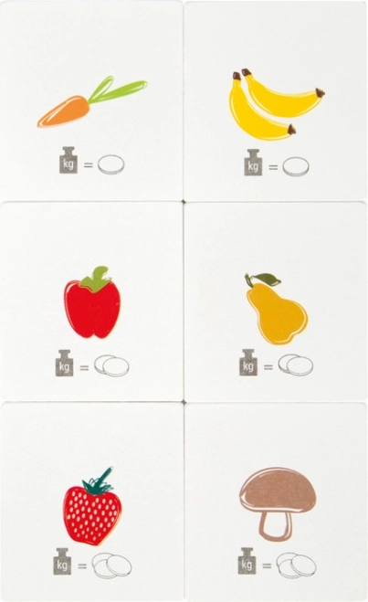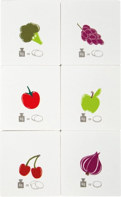 Pachetul include șase carduri față-verso cu imagini de alimente și monede, care le arată copiilor în mod vizual că mai multe monede înseamnă un preț pe kilogram mai mare. Jocul dezvoltă în mod natural abilitățile matematice de bază, motricitatea fină și coordonarea mână–ochi. Construcția robustă din lemn și plastic asigură durabilitate și utilizare sigură.