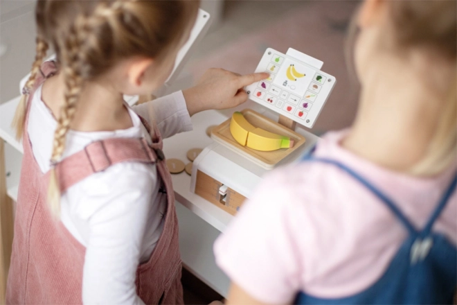 Cântarul stilat pentru copii, din lemn de calitate și acrilat, transformă orice magazin sau bucătărioară într-un mic supermarket. Datorită mecanismului funcțional pe arc, indicatorului de greutate mobil și cupei de cântărire extra-mari, copiii se bucură de un joc realist și în același timp învață să numere, să compare greutăți și bazele măsurării. Setul include 6 carduri față-verso cu fructe și legume cu monede pentru a facilita înțelegerea prețurilor.