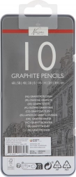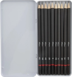 Setul de 10 creioane grafit acoperă întregul interval pentru lucru creativ: de la moi pentru umbre saturate și trăsături expresive până la tari pentru detalii fine și linii tehnice. Etuiul metalic inclus protejează creioanele la transport și menține ordinea în atelier și la școală.
