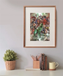 Scena colorată cu supereroi iese în evidență datorită tiparului de calitate și cartonului rigid.