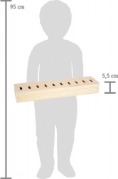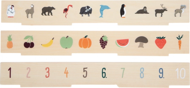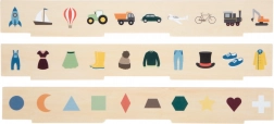 Jucărie inteligentă din lemn pentru copii de la 3 ani, care combină sortarea, potrivirea și învățarea cuvintelor. Include trei panouri față-verso și 60 de jetoane ilustrate pe teme precum transport, animale, numere, forme, îmbrăcăminte, fructe și legume. În timpul jocului, copiii își dezvoltă motricitatea fină, recunoașterea culorilor și formelor și își îmbogățesc vocabularul în mod natural. Depozitarea în siguranță este asigurată de o cutie din lemn cu 10 compartimente și închideri cu elastic – ideală și pentru călătorii.