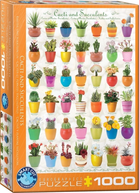 Descoperiți puzzle-ul captivant EUROGRAPHICS, cu tematică de cactuși și suculente, din 1000 de piese. Datorită decupajului neregulat, oferă o dificultate mai ridicată, iar pe imagine veți găsi denumirile plantelor în engleză și latină. Asamblat, măsoară aproximativ 48,89 × 67,63 cm.