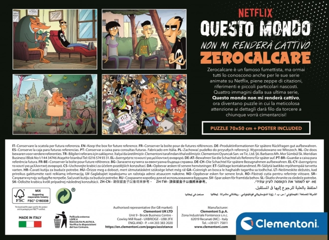 Bucurați-vă de asamblare de calitate cu puzzle-ul CLEMENTONI inspirat de serialul Netflix Lumea asta nu mă va doborî de Zerocalcare. Pachetul conține 1000 de piese și un ghid al motivului pentru o asamblare mai ușoară. Ideal pentru fanii serialului și iubitorii de puzzle-uri de design, cu piese fin decupate și îmbinări precise.