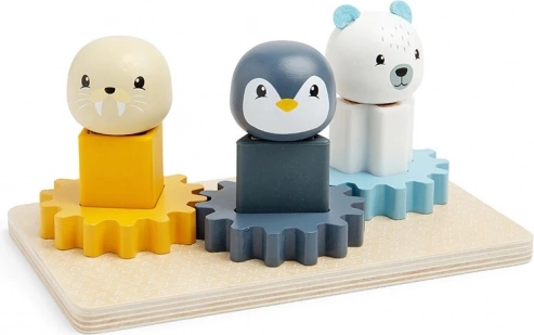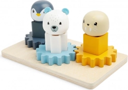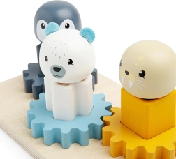 Include pinguin, morsă și urs polar pe care copiii le pot plasa pe suporturi de diferite culori și le pot roti.