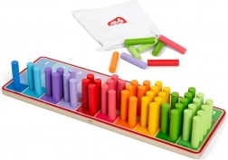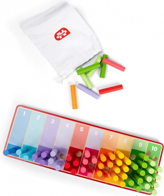 Bețișoarele de numărare curcubeu sunt alegerea ideală pentru copiii de la 18 luni, care doresc să învețe să numere și să recunoască culorile. Jucăria conține o placă de lemn cu secțiuni colorate și 55 de bețișoare colorate de introdus în aceste secțiuni. Toate componentele acestui produs sunt fabricate din lemn certificat FSC®, fiind astfel nu doar sigure pentru copii, ci și prietenoase cu mediul înconjurător.