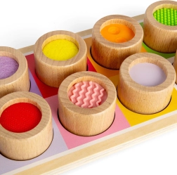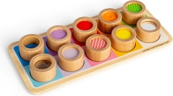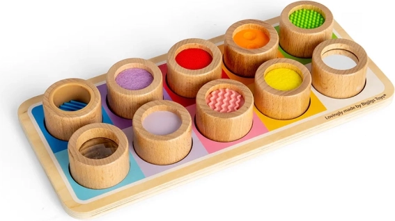 Această placă senzorială uimitoare este modalitatea perfectă de a introduce copiii la diferite texturi și culori. Conține o placă de lemn cu găuri colorate și unsprezece piese de inserție, fiecare având un finisaj unic, de la silicon zimțat la pâslă fină. Această jucărie nu numai că ajută la diferențierea texturilor variate, dar promovează și coordonarea mână-ochi.