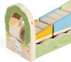Permite copiilor să exploreze și să învețe prin joc interactiv, plasând cilindrul zăngănitor și urmărind mișcarea acestuia pe rampă.