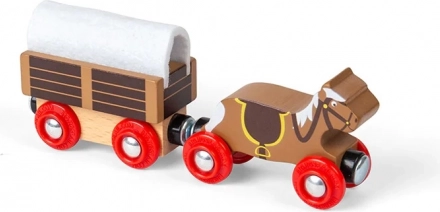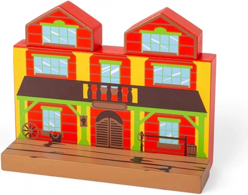 Această cale ferată de lemn fascinantă aduce aventura Vestului Sălbatic direct în camera copiilor. Copiii pot transporta căruțele lor cu cai și trăsuri pe traseul de lemn sinuos, pot tranzita pe tunelul montan spre mina de aur sau pot trece pe lângă vechiul ranch. În total, cele 62 de piese creează nenumărate scenarii de joc.