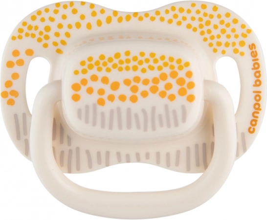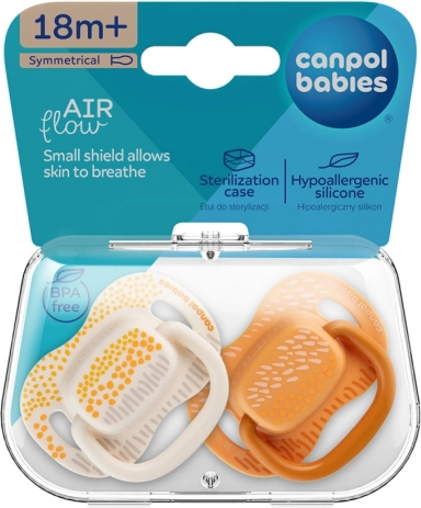 Set practic de două suzete CANPOL BABIES cu vârf simetric din silicon pentru copii de la 18 luni. Oferă silicon hipoalergenic, fără gust și miros, scut ventilat pentru respirarea liberă a pielii și capsulă modernă pentru dezinfectare rapidă în cuptorul cu microunde. Suzetele sunt rezistente la deformare, ușor de menținut curate și nu conțin BPA.