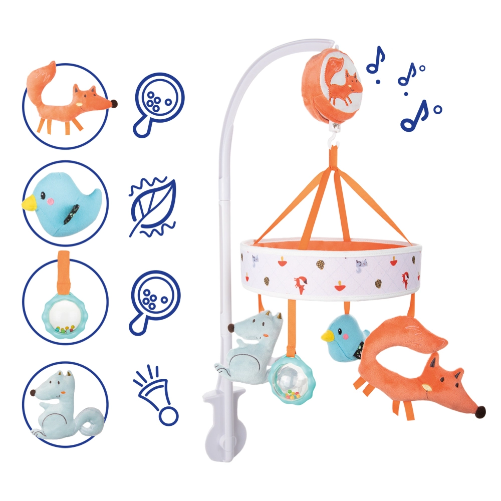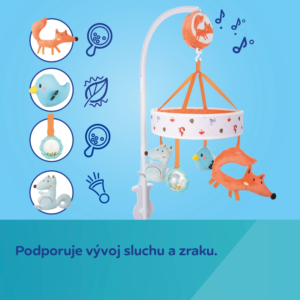 Caruselul colorat pentru pătuț cu animăluțe de pluș drăgălașe din colecția FOX atrage atenția bebelușului și creează o rutină plăcută de adormire. Mecanismul cu înfășare manuală redă melodii calme, care liniștesc copilul și facilitează adormirea – fără baterii.