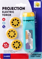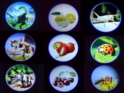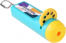 Această lanternă proiector de buzunar transformă serile în povești captivante. Trei discuri interschimbabile oferă temele dinozauri, insecte și fructe, fiecare cu opt cadre – în total 24 de imagini. Introdu doar discul, alege cadrul prin rotire și proiectează pe o suprafață netedă.