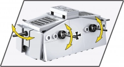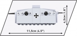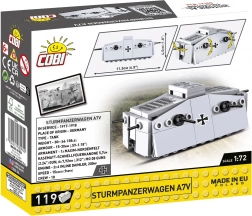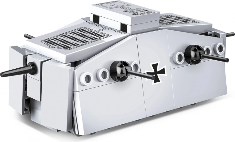 Sturmpanzerwagen A7V a fost primul tanc german folosit la finalul Primului Război Mondial. Acest vehicul blindat iconic, cu un echipaj de până la 18 soldați, era înarmat cu un tun Nordfeld de 57 mm și șase mitraliere MG 08. Modelul COBI la scara 1:72, cu o lungime de aproximativ 11,5 cm, păstrează trăsăturile tipice ale originalului și impresionează prin imprimeurile precise ale crucilor, grilelor și trapelor.