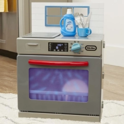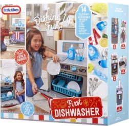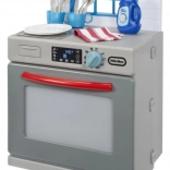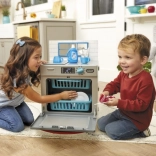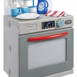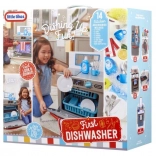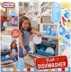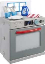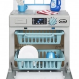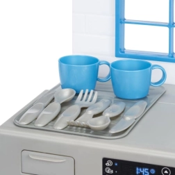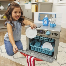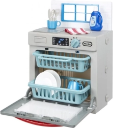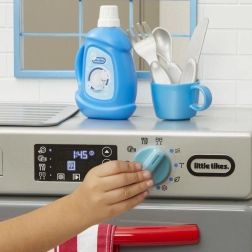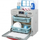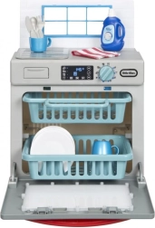 Cei mici vor îndrăgi designul realist al mașinii de spălat vase gri cu accente roșii, care arată ca un electrocasnic adevărat. După adăugarea „detergentului” și rotirea butonului funcțional, se aprinde lumina și pornesc sunete autentice de spălare. Copiii pot deschide ușițele, glisa coșurile și încărca sau scoate vasele, dezvoltând astfel motricitatea și imaginația.